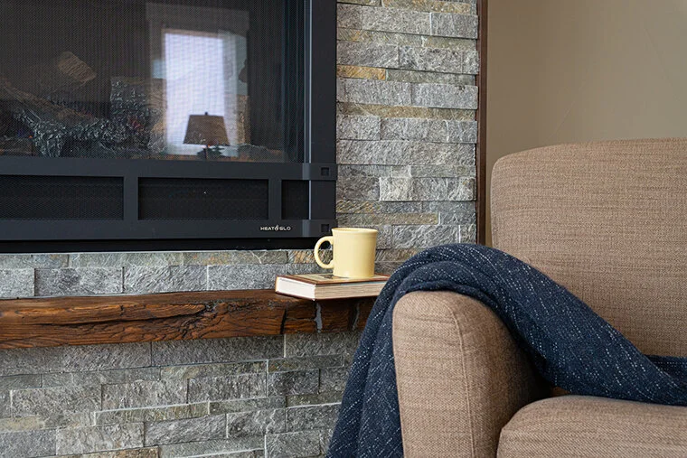 Who says a mantel has to go on top? This full height fireplace facade in a primary bedroom had just enough room for a shallow mantel set below the fireplace. A perfect height for that must have cup of coffee and good book.